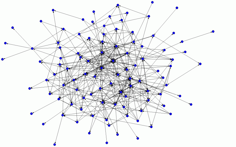 Der generierte Zitationsgraph basiert auf einer Gesamtzahl von 425 Zitationsbeziehungen zwischen 103 aktiven Netzwerkakteuren, d. h., lediglich 18 Akteure aus dem erhobenen Geographen-Netzwerk tauchen weder als zitierte noch als zitierende Autoren auf. (21) Auffallend ist, dass das Netz nur aus einer einzelnen Komponente besteht, es also keine mit der Hauptkomponente unverbundenen Dyaden oder Gruppen von Autoren (Subkomponenten) gibt, was zunächst für einen relativ stark integrierten Netzwerkzusammenhang spricht. Die maximale Distanz (22) zwischen zwei Akteuren in dem Netzwerk beträgt sechs Schritte (hops), d. h., auf dem kürzesten Weg (shortest path) zwischen zwei beliebigen Akteuren aus dem Netz liegen höchstens fünf andere Knoten. (23) Die durchschnittliche Pfadlänge aller kürzesten Verbindungen (geodätische Distanz) beträgt 2,7 Schritte. (24)