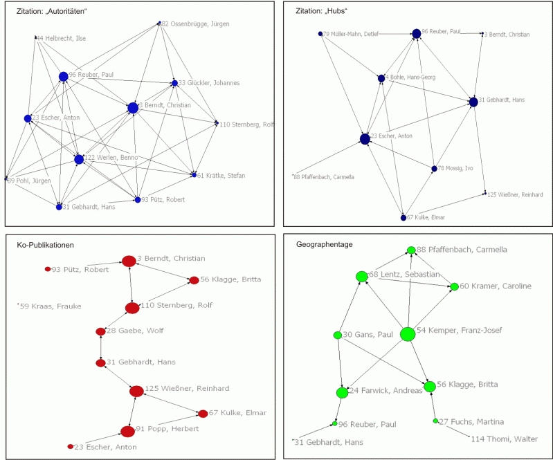 Die aus den relationalen Datensätzen generierten Netzwerke sollen verschiedene Dimensionen bzw. Subnetze des Wissensnetzwerks abbilden. Selbstverständlich kann die Analyse dieser Subnetze (‚Zitationen', ‚Ko-Publikationen', ‚Geographentage') nur der Versuch einer Annäherung sein. Dieser Versuch basiert auf der plausiblen Annahme, dass sich in den Strukturen und Positionen innerhalb der drei Subnetze Grundstrukturen des humangeographischen Netzwerks widerspiegeln und dass sich aus der systematischen Analyse der erhobenen Netze auch Aussagen über die Konstitution des ‚Wissensnetzes der Humangeographie' ableiten lassen.