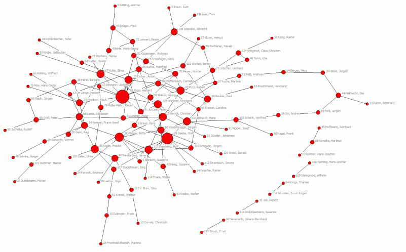 Wie bei den Zitationen, so lässt sich auch bei den Ko-Publikationen die erhobene Menge der gemeinsam publizierten Titel und die dazugehörigen Autoren/Herausgeber als Graph darstellen. In dem Ko-Publikationsgraphen bilden die untersuchten Hochschullehrer die Knoten, und die verbindenden Kanten sind die ungerichteten/reziproken Publikationsbeziehungen. Abbildung 2 visualisiert das erhobene Ko-Publikationsnetz: