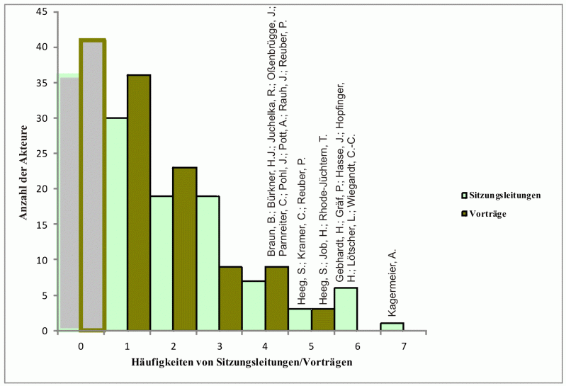 (30) Diese Zahl bedeutet keineswegs, dass die betreffenden Akteure weder als Sitzungsleiter noch als Referent auf den Geographentagen auftraten.. Denn es ist durchaus möglich, dass sie als Sitzungsleiter keinen der erhobenen Netzwerkakteure einluden oder im Rahmen einer Sitzung referierten, die nicht von einem Netzwerkakteur geleitet wurde.