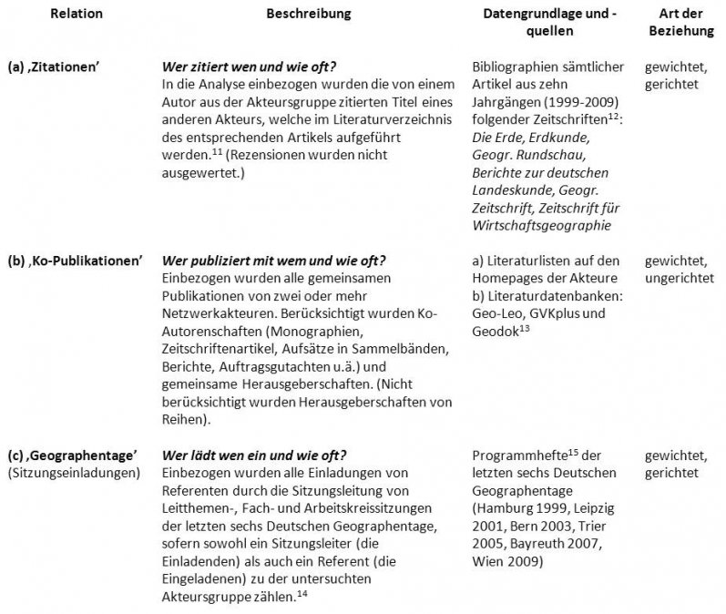 In dem Studienprojekt stand bei der Auswahl der Proxy-Indikatoren neben dem generellen Kriterium der Datenverfügbarkeit die Überlegung im Vordergrund, mit den verschiedenen Relationen eine möglichst große Bandbreite unterschiedlicher Interaktionsformen und somit mehrere relevante Dimensionen von Wissensbeziehungen abzubilden. Deshalb wurden drei Arten wissenschaftlicher Interaktion ausgewählt: (a) Zitationen, (b) Ko-Publikationen, (c) Einladungen zu Geographentagssitzungen. Tabelle 1 fasst die Datengrundlagen und die Art der erhobenen Relationen zusammen: