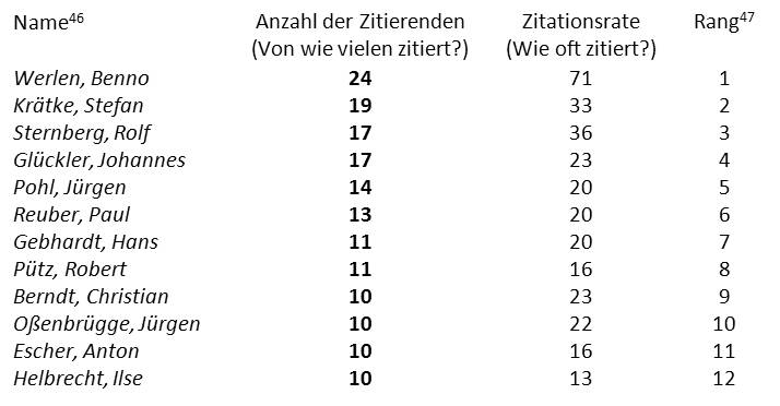 (43) Fast ein Viertel der 101 Akteure, die in einer der untersuchten Zeitschriften veröffentlicht haben, hat mindestens einmal einen Beitrag von B. Werlen zitiert.