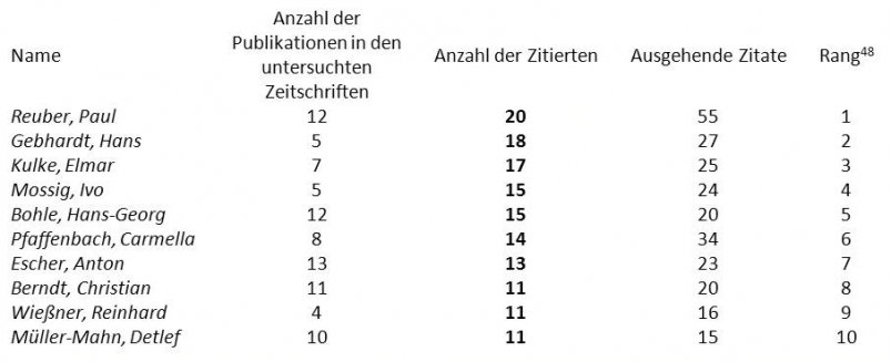(47) Ausschlaggebend für die Rangfolge ist zunächst die Anzahl der direkten eingehenden Beziehungen, der ungewichtete Indegree (Anzahl der Zitierenden). Bei gleichen Werten ist die Zitationsrate (gewichteter Indegree) das zweite Kriterium.