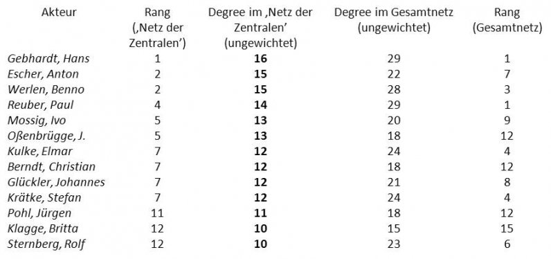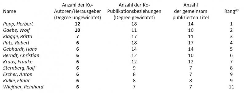(49) Ausschlaggebend für die Rangfolge ist zunächst die Summe der direkten Kontakte, der ungewichtete Degree (Anzahl der Ko-Autoren/Herausgeber). Bei gleichen Werten wird die Anzahl der Ko-Publikationsbeziehungen als zweites Kriterium berücksichtigt (gewichteter Degree). Bei identischen Werten teilen sich die Akteure den Rangplatz.