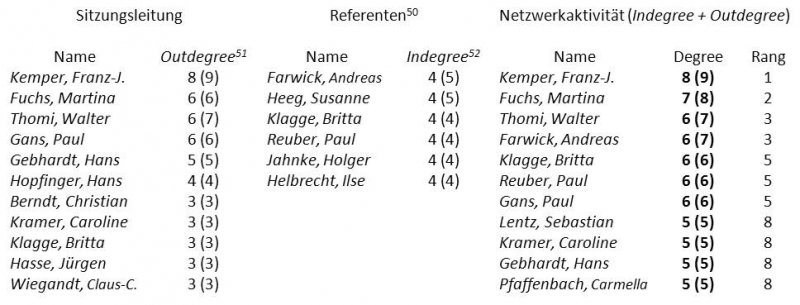 (46) Die in dieser Studie erstellten ‚Top-Listen' wurden gebildet, indem zunächst grob die zehn Akteure mit den höchsten ungewichteten Degreewerten identifiziert wurden. War es nicht möglich exakt zehn Personen abzugrenzen, da die Akteure auf den folgenden Plätzen identische Degreewerte aufwiesen, wurde die Liste bis zu dem Akteur erweitert, der als letzter denselben Wert erreicht (vergl. Tabelle 2 und 4). In einer der Listen (‚Geographentage') sind weniger als zehn Akteure aufgeführt, da nur wenige Akteure sich durch einen höheren Degree abhoben; eine Zehnerliste machte in diesem Fall keinen Sinn (vergl. Tabelle 5).